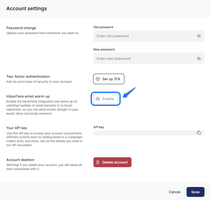 1. To start, you need to enable your InboxFlare account in Switch Jam Digital. Go to your Account settings in Switch Jam Digital and find the InboxFlare email warm-up. Click “Enable”.